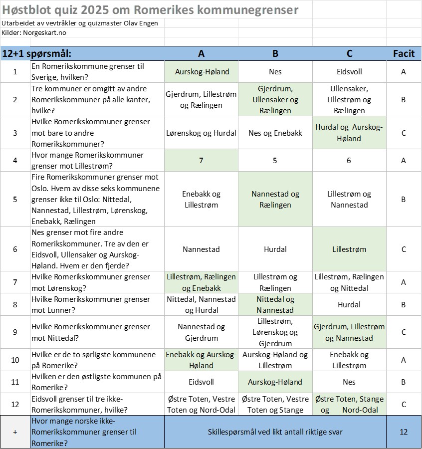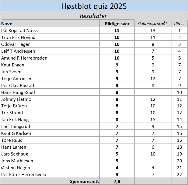 Aller mest bemerkelsesverdig var at snittet av svarene på spørsmålet om quiz-mesterens o-løp var på 1212, når faciten sier 1214 – og svarene spriker fra 459 til 3000! Oddvar hørte kanskje at quizmesteren sa tallet til et annet bord før han leverte? Hvis ikke er rett svar mildt sagt imponerende bra gjetning!