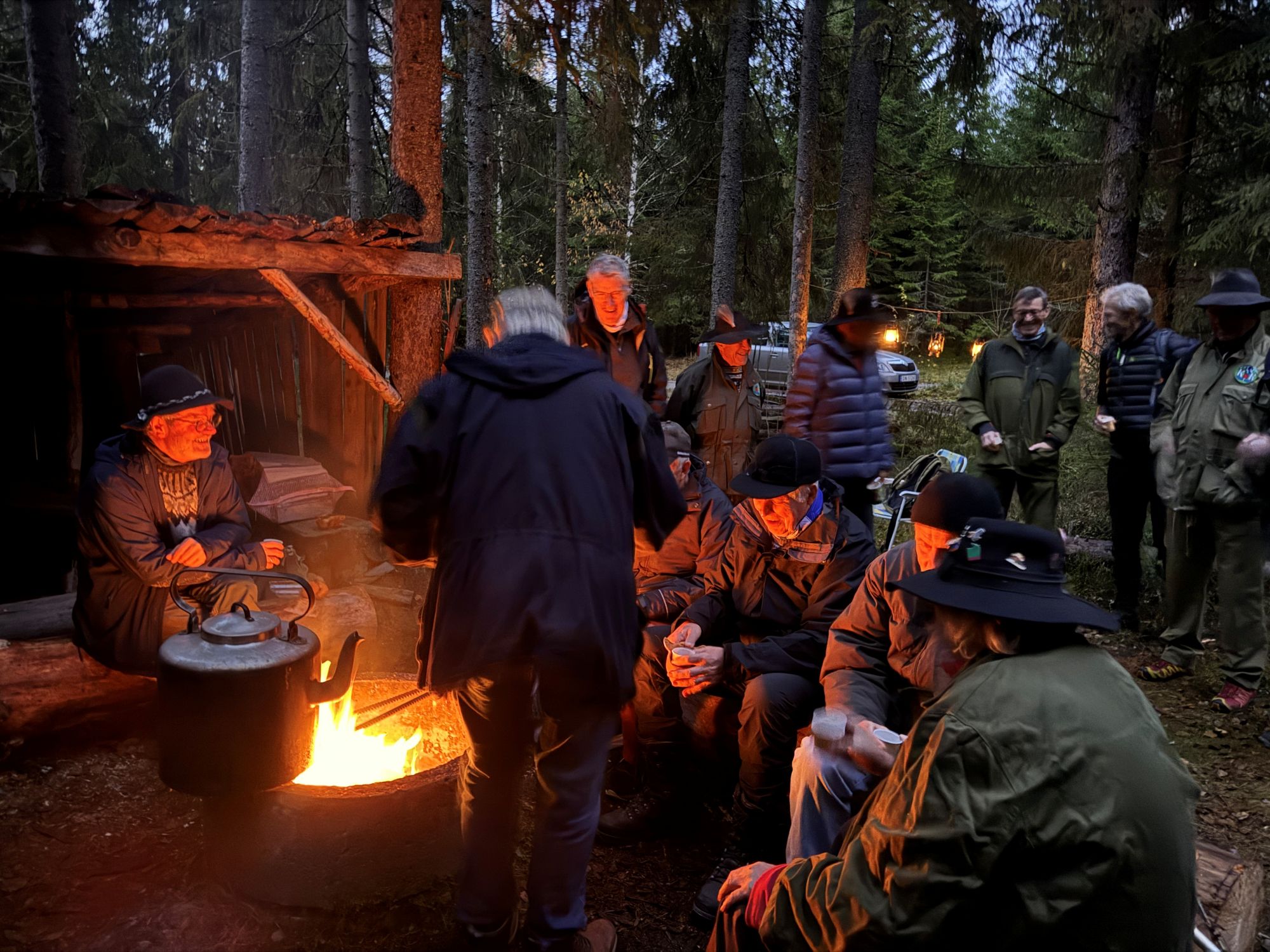 Skaffer Tron Erik hadde på forhånd skaffet ved, mens skriver Jan Erik og eks-talmann Leif var tidlig ute for å få liv i bål og kaffekjele. De fikk imidlertid raskt besøk av flere, og i skyggen av skogen og i lyset fra oljelampene samlet det seg etter hvert 21 skogkarer rundt bålet. Det ble grilling, god stemning og mye å prate over en kopp sterk bålkaffe i den milde høstkvelden.