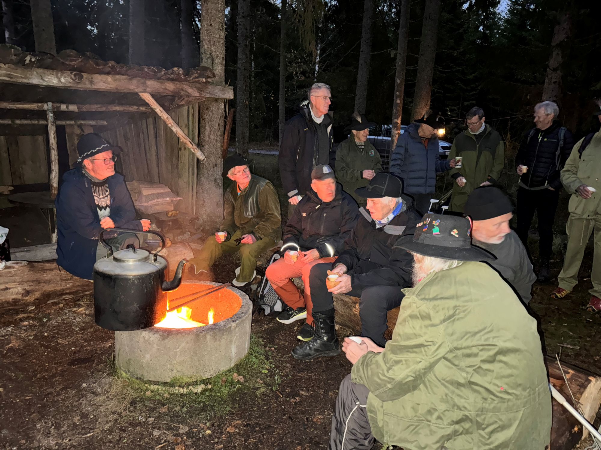 Skafferen hadde kjørt fram noen vedsekker til bålplassen som ligger et snaut pilskudd øst for Sandtjernhytta. Talmann og kassebevarer strevde litt med å få bålet i gang, men omsider ved 4-tida putret det i «storsvarten» og kaffen var klar. Etter hvert dukket det opp 21 skogkarer med fjøsløktene sine. Noen kom seinere enn nødvendig fordi Talmannen hadde oversett at det er nødvendig med refleks på postflaggene for å vise vei i mørket. Denne feilen bør ikke gjentas.